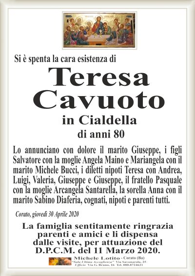 Il rito funebre è stato celebrato il giorno 1 maggio 2020