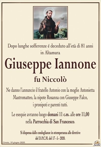 Il rito funebre è stato celebrato il giorno 11 giugno 2020