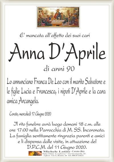 Il rito funebre è stato celebrato il giorno 18 giugno 2020
