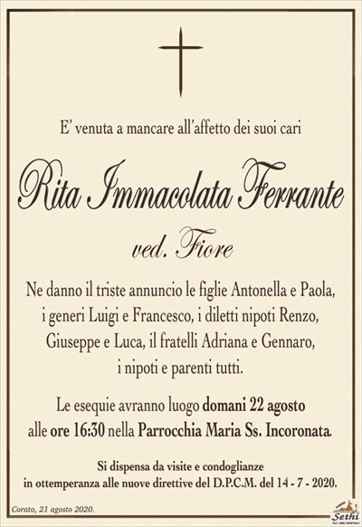 Il rito funebre è stato celebrato il giorno 22 agosto 2020
