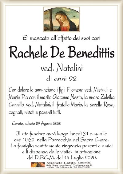 Pubblicazione in evidenza di un manifesto sul portale, posizionato tra i primi 10 annunci subito sotto quello del defunto, garantendo massima visibilità. Incluso anche un manifesto digitale presso la sala d’accoglienza e un manifesto cartaceo presso la chiesa. La posizione online segue l’ordine cronologico di pubblicazione.