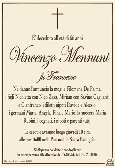 Il rito funebre è stato celebrato il giorno 10 settembre 2020