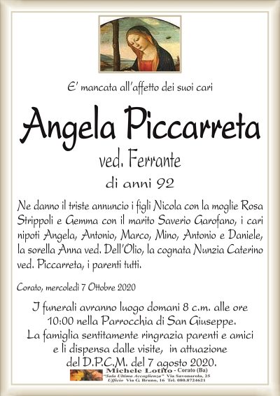Il rito funebre è stato celebrato il giorno 8 ottobre 2020