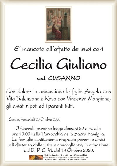 Il rito funebre è stato celebrato il giorno 29 ottobre 2020