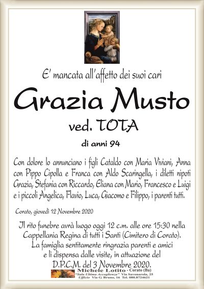Il rito funebre è stato celebrato il giorno 12 novembre 2020