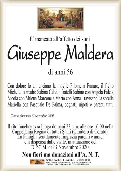 Il rito funebre è stato celebrato il giorno 23 novembre 2020