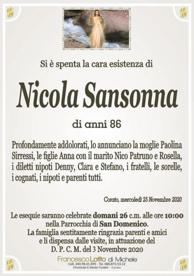 Il rito funebre è stato celebrato il giorno 26 novembre 2020