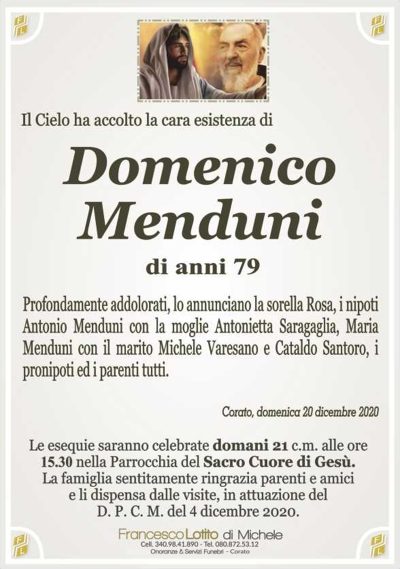 Il rito funebre è stato celebrato il giorno 21 dicembre 2020