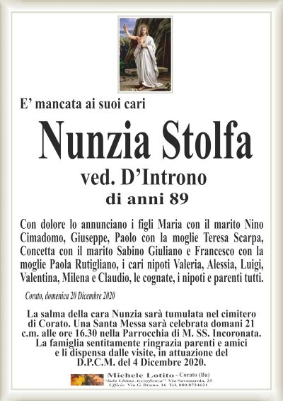 Il rito funebre è stato celebrato il giorno 21 dicembre 2020