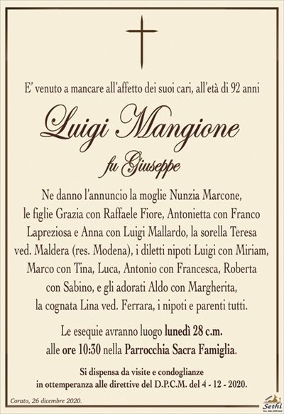 Il rito funebre è stato celebrato il giorno 28 dicembre 2020
