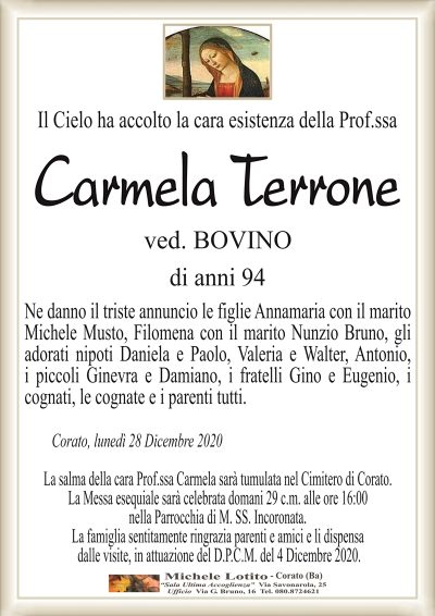 Il cognato Nicola Bovino, unitamente ai propri figli Francesco e Marida, Aldo e Tina, Michele e Antina, Filomena e Leonardo, Laura e Cataldo