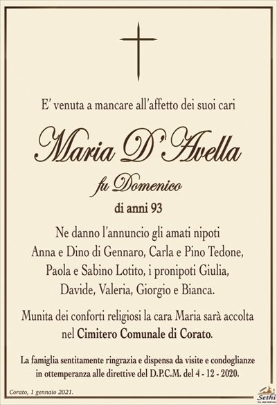 Il rito funebre è stato celebrato il giorno 2 gennaio 2021