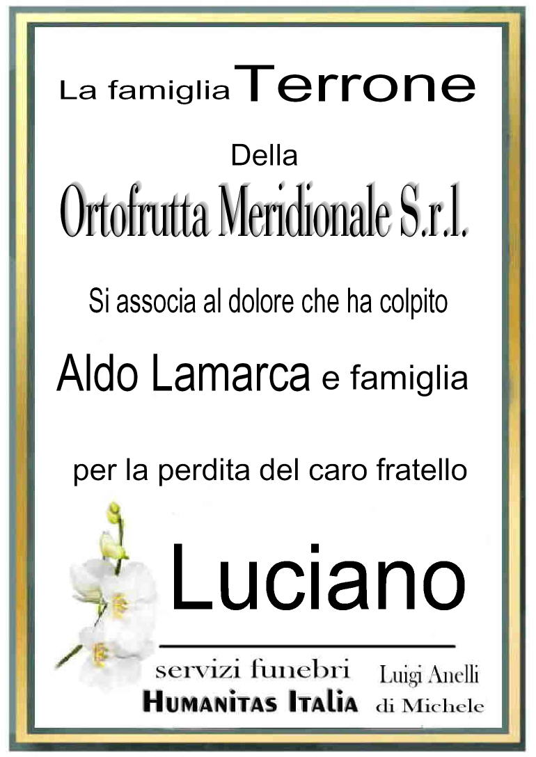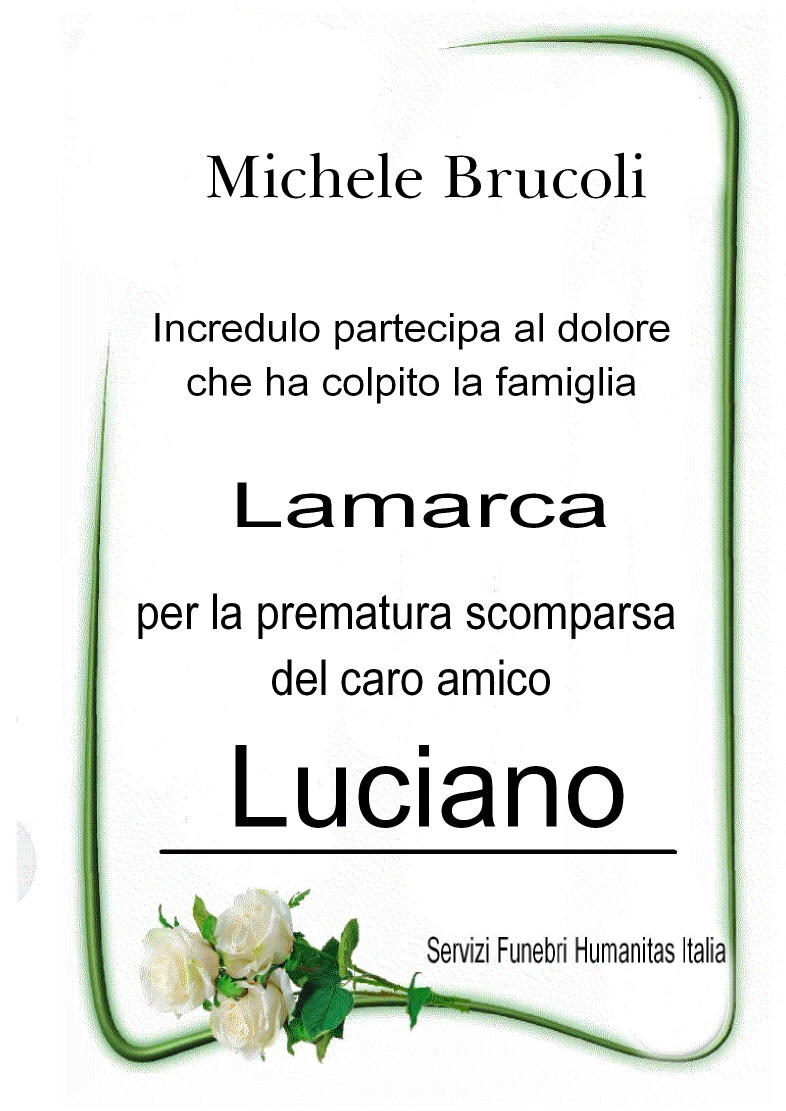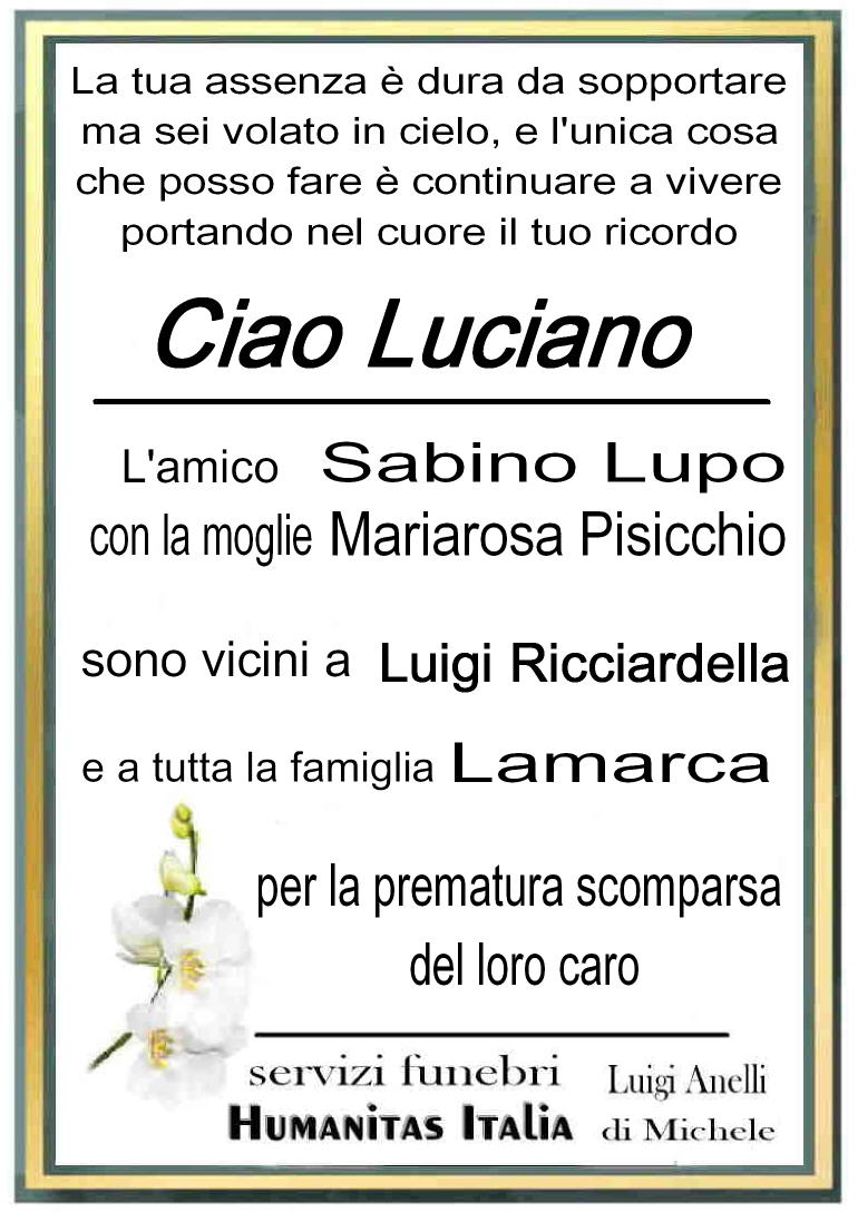 Ne danno il triste annuncio la moglie Ada Ricciardella, i figli Pasquale e Rosita, i fratelli Cataldo Lamarca con Nunzia Farucci, Nicola con Isa Mancini, Giuseppe e Luigi con Mariella Venitucci, la suocera Rosanna Giaconelli, il cognato Luigi Ricciardella con Maria Elisa Marcone, i nipoti e parenti tutti.